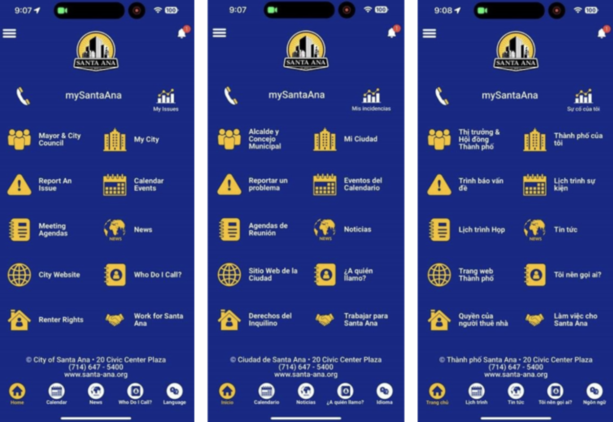 Our new and improved mySantaAna app offers expanded features and full language support in English, Spanish and Vietnamese. The updated app makes it easier than ever to report issues like graffiti or potholes, receive push notifications about important City updates, and stay connected to local services.